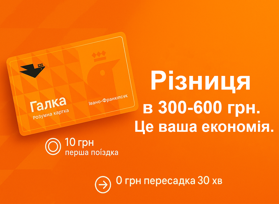 Транспортна картка «Галка». Перша поїздка — 10 гривень, а пересадка впродовж 30 хвилин — безкоштовна (умова – зелена галка при повторній валідації на валідаторі). І тут відкриваються зовсім інші цифри. Якщо ви не пересаджуєтесь — виходьте 600 гривень на місяць. Але якщо ваш маршрут передбачає пересадку, і встигнете в межах пільгового часу, то вся дорога — лише 10 гривень. За місяць ціна — 300 гривень.