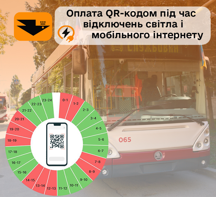 QR-код — це сучасний спосіб оплатити проїзд за допомогою смартфона. Швидко, просто і зручно: відсканував — оплатив — отримав електронний квиток. Тільки є важливий момент: QR-оплата повністю залежить від інтернету для її проведення. Під час відключення світла за графіками в місті відбувається просідання мобільного зв’язку, тоді цей спосіб може давати збої, навіть коли сам на вашому смартфоні є декілька поділок.